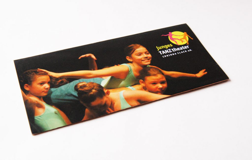 Ein Faltblatt für das Junge Tanztheater von Corinna Clack im Querformat mit 8 Seiten und Zickzackfalz. Dieser Folder wird nach unten geöffnet, so dass ein Ziehharmonika-Effekt entsteht. Man kann ihn wie einen Leporello falten, blättern und aufziehen.