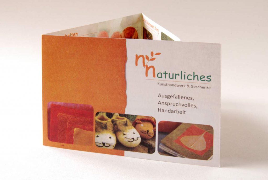 Das Layout dieses Folders, ist ebenfalls für einen 6-Seiter im Wickelfalz angelegt, allerdings geschlossen ein Postkarten-Format quer. Da der Kunde mit Naturpapieren aus Nepal handelt, legte er Wert auf ein umweltfreundliches Druckpapier.
